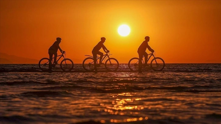 Bisiklet tutkunları da Van Gölü'ndeki çekilmeye ve küresel ısınmaya dikkati çekmek amacıyla çekilmenin yaşadığı bölgeye giderek suyun sığ olduğu bölgeler ile adacıklarda bisiklet sürdü.