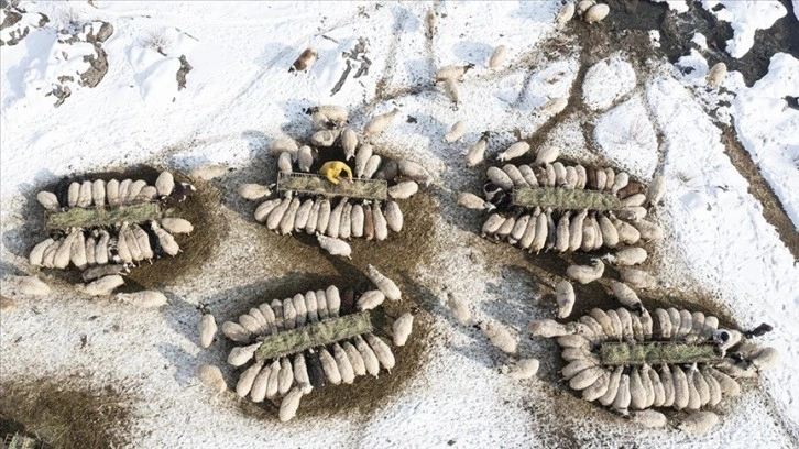 Besiciler, evlerine yakın bölgelerde istifledikleri ot balyalarını, ezdikleri karın üzerine sererek hayvanlarına veriyor.