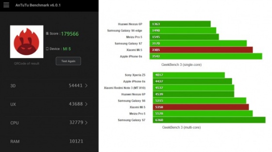 1,5 yılı aşkın bir geliştirme sürecinin ardından piyasaya çıkmaya hazırlanan Xiaomi Mi 5, AnTuTu Benchmark testinden toplamda 179.566 puan almayı başardı.
