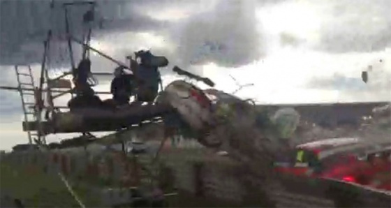 İngiltere’deki otomobil yarışında, kaza yapan otomobillerden biri kontrolden çıkarak çekim için kurulan kuleye çarptı. Yarışı görüntüleyen kameraman da yıkılan kulenin altında kaldı.