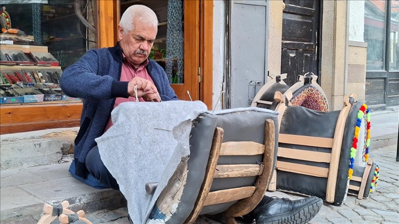 Baba mesleğini 52 yıldır sürdüren Atıcı, yük hayvanlarında kullanılan semerleri geleneksel yöntemlerle üretiyor.