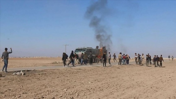 YPG/PKK yandaşlarının molotofkokteyli attığı Rus askeri araçlarından birinin arka tarafı alev alırken, araç bir süre durduktan sonra yoluna devam etti.