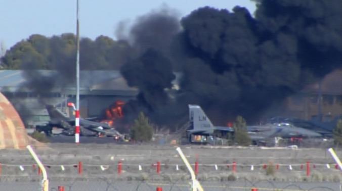 İspanya'da, Los Llanos askeri üssünden havalanan Yunanistan'a ait F-16 uçağı, park halindeki uçakların olduğu bölgeye düştü.