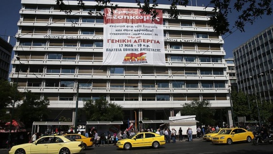 Kent merkezindeki Sintagma Meydanı'nda yer alan binaya giren bir grup eylemci, ön cepheye "Sermaye-AB ve hükümetin yeni hırsızlığına karşı 17 Mayıs'ta genel greve" yazılı pankart astı.