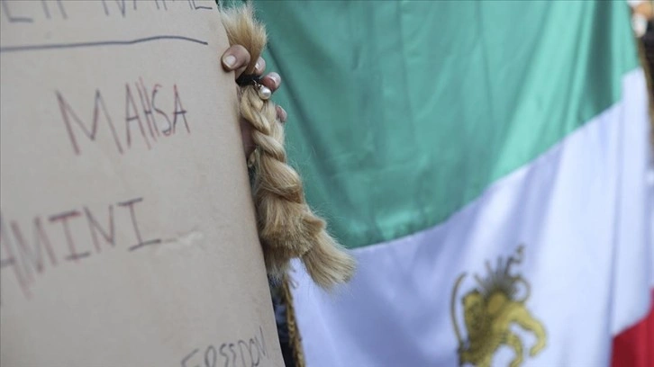 İran yönetimini protesto eden sloganlar atan gruptakiler, açtıkları dövizlerle Emini'nin ölümüne tepki gösterdi.