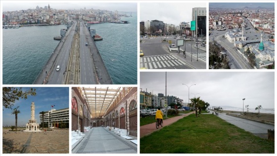 İzmir, Denizli, Aydın, Manisa, Afyonkarahisar ve Uşak'ta "evde kal" çağrısına uyulması ile 65 yaş ve üstü kişilere sokağa çıkma kısıtlaması getirilmesi sonucu, yağmurun da etkisiyle normalde yoğunluk yaşanan alanlar sessizliğe büründü.