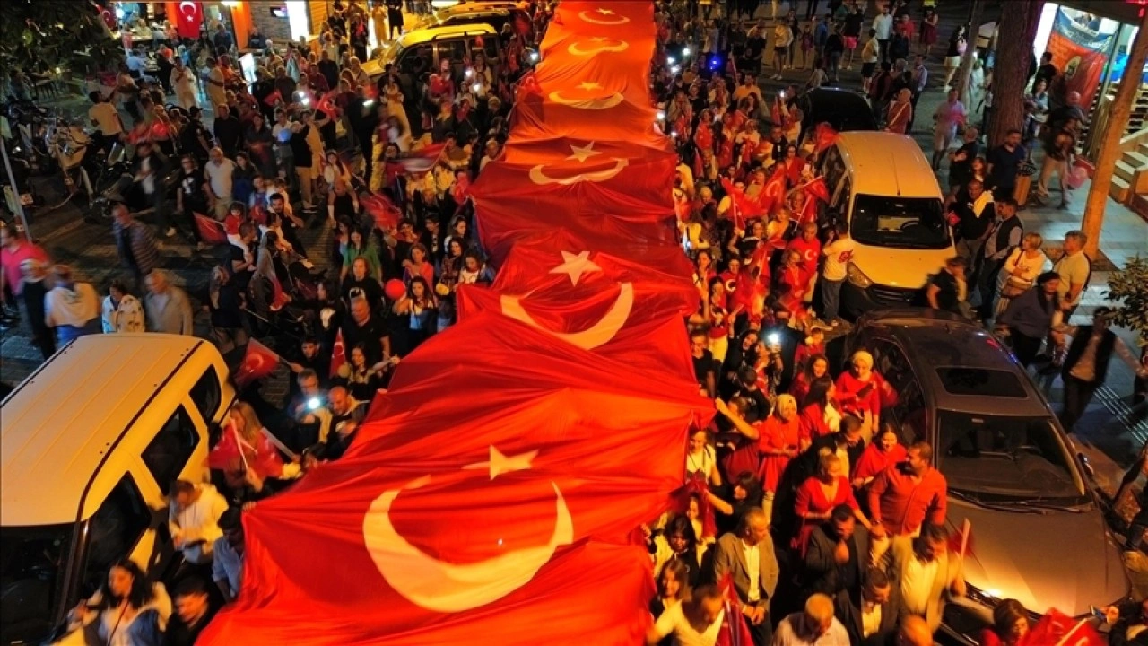 Tevfikiye köy meydanında toplanan vatandaşlar ise meşaleler yakıp 101 metre uzunluğundaki Türk bayrağını açtı.