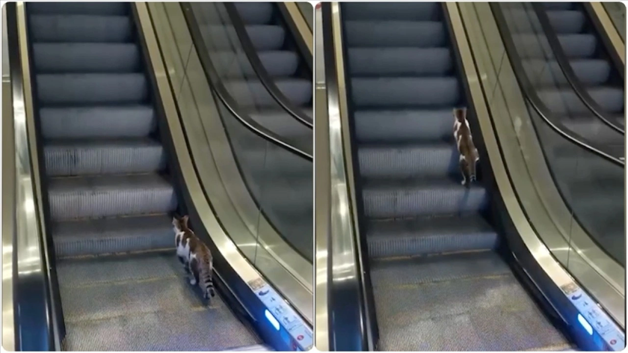 Havalimanında yürüyen merdivene ters yönden binen kedinin yukarı çıkma çabası, cep telefonu kamerasıyla kaydedildi.