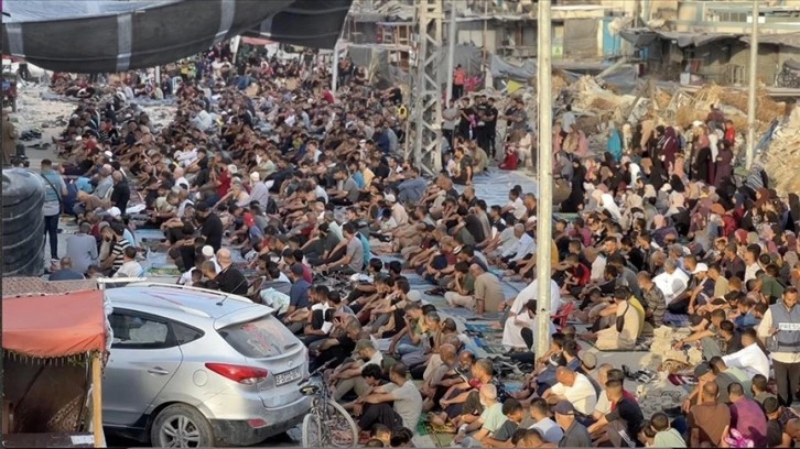 Gazze Şeridi'nde 9 aydır devam eden savaşa ve acılara rağmen tekbir sesleri arasında bayram namazını kılan Filistinliler, namaz sonrasında birbirleriyle bayramlaştı.
