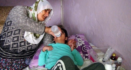 Çocuğunun yanından hiç ayrılmayan Uyanık, şöyle konuştu: “Eşimi 4 yıl önce kaybettim. Eşimin yokluğunda çocuklarıma hem anne hem de baba olmaya çalıştım. Bir çocuğum doğuştan zihinsel ve bedensel engellidir. Evimin tuvaleti, banyosu, mutfağı ve diğer kısımları neredeyse kullanılamaz halde ama ben yine de çocuklarımla beraber yaşamaya çalışıyorum. Allah komşularım ve devletimizden razı olsun, çünkü bana yardımcı oluyorlar. Yatalak olan çocuğum ağız yoluyla beslenemediği için karnında ameliyatla beslenmesi için bir delik açıldı. Çocuğumu bu yolla mama ile beslemek zorunda kalıyorum.”