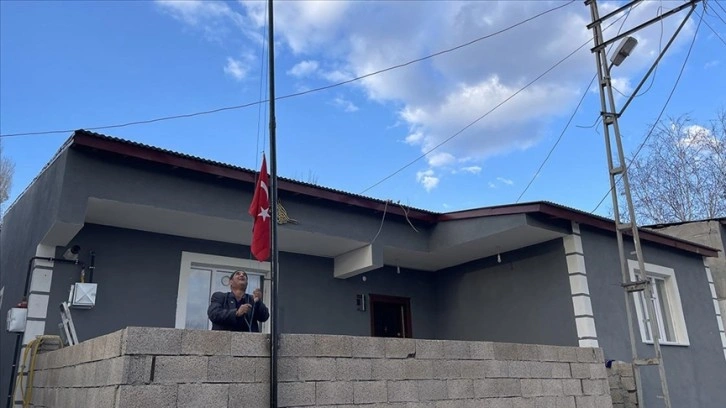 Evinin önünde İstiklal Marşı okuyup bayrağı göndere çekiyor