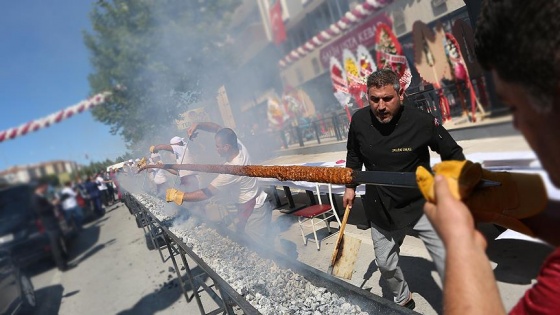 Kebap ustası Salih Oral tarafından 10 kişilik ekiple 25 kilogram malzeme kullanılarak yaklaşık 1,5 saatte hazırlanan kebap, caddeye kurulan mangalda pişirildi.