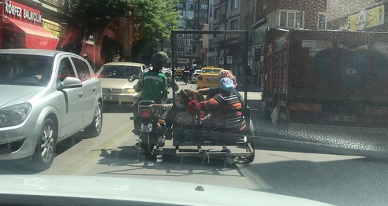 Merkez Sakarya Caddesi üzerindeki tehlikeli yolculuk cep telefonu kameralarına yansıdı. Görüntülerde, motora oturmuş 2 erkeğin yanı sıra ek olarak kendi imkanlarıyla yapılan sepet bölümünde ise 3'ü çocuk 2 kadının kimseye aldırış etmeden yolculuk yaptığı görüldü. Olası bir kaza durumunda büyük sorunlara neden olabilecek yolculukta kimsenin kask takmaması da dikkatlerden kaçmadı. Motosiklet bir müddet sonra ara sokaklara girerek gözden kayboldu.