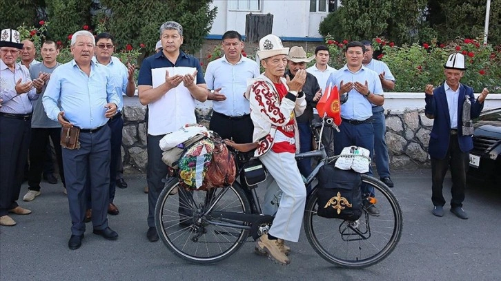 Kırgızistan'ın Oş kentinde yaşayan bisiklet tutkunu Taştanov'un bisiklet yolculuğu için kent meydanında tören düzenlendi.