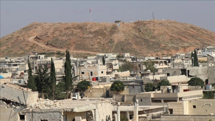 AA'nın ilçe içindeki merkezi noktalar ve çıkışlarından çektiği görüntülerde, örgütün tepelik alanda büyük bir bayrak direğinde Beşşar Esed rejimi bayrağı dalgalandırdığı görülüyor.