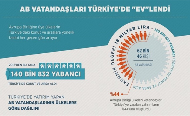 AB üyesi ülke vatandaşları arasında Türkiye'den en fazla İngilizler taşınmaz aldı. 24 bin 456 İngiltere vatandaşı, Türkiye'de konut ve arsa sahibi oldu.