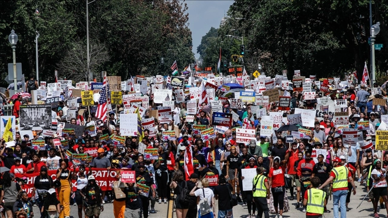 "Washington'da işgale son" ve "Trump hemen gitmeli" yazılı pankartlar taşıyan kalabalık, sloganlar atarak federal güçlerin haftalardır kentte devam eden varlığını protesto etti.