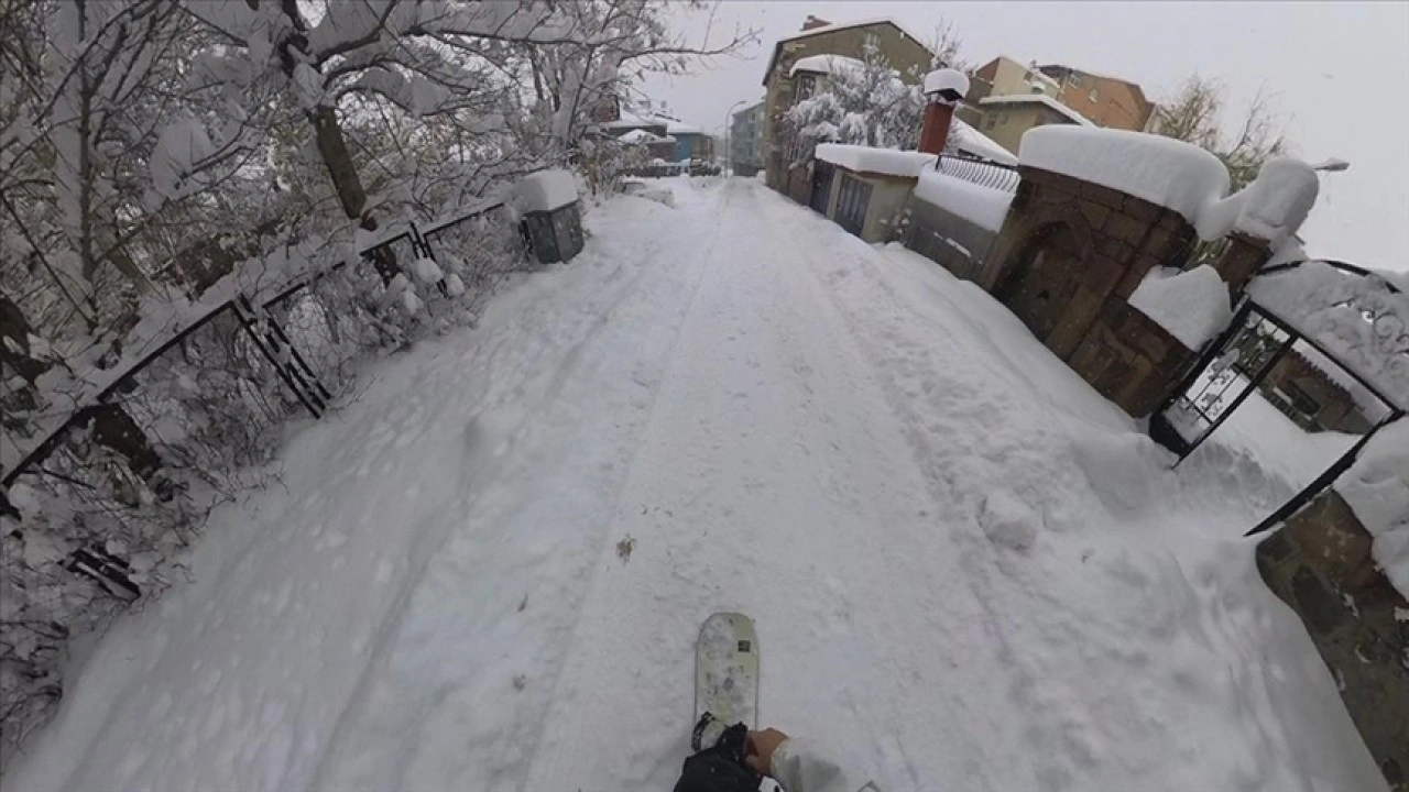 Adanalı Gürler, yer yer kar kalınlığı nın 1 metreyi bulduğu ve araç ların ilerlemekte zorlandığı Murat Paşa Mahallesi 'ndeki bazı sokaklara snowboard takımlarıyla çıktı.