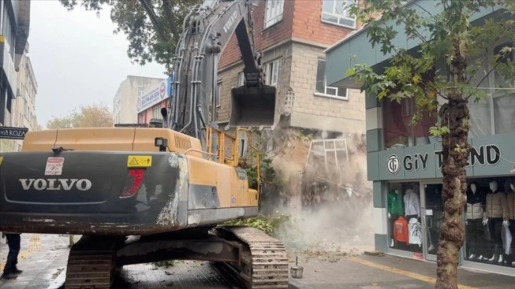 Ekipler, caddeyi trafiğe kapatarak iş makinasıyla binayı kısa sürede yıktı.