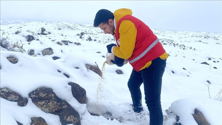 Ekipler ile gönüllüler bu kapsamda, araçlarla Ağrı Dağı'nın eteklerine gitti. 2 bin rakıma çıkan ekipler, burada karla kaplı araziye 800 kilogram buğday serpti.