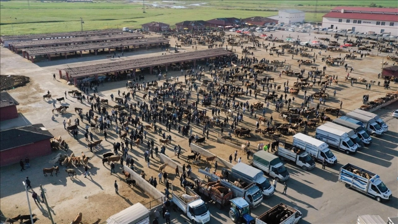 Hayvan pazarındaki yoğunluk, dronla görüntülendi.