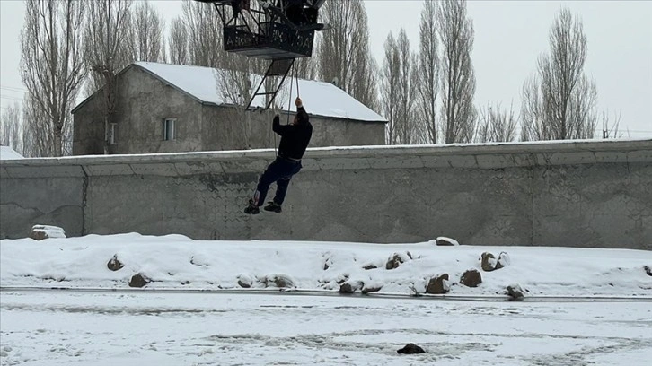 Halat yardımıyla buzun üzerine inen görevliler, köpeği kurtardı.