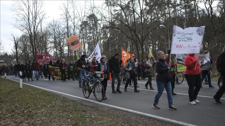 Tesla'nın Avrupa'daki ilk fabrikası "Giga Berlin" yakınlarındaki Fangschleuse Tren İstasyonu'nda toplanan yüzlerce kişi, sloganlar atarak fabrikanın etrafındaki ormanlık alanda yürüdü.