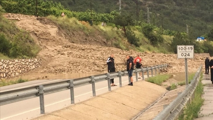 Karayolları ve DSİ ekiplerinin, suyu tahliye etme, yoldaki taş ve diğer malzemeleri temizleme çalışmaları devam ediyor.
