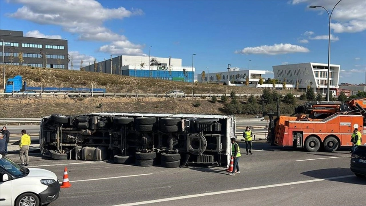Anadolu Otoyolu'nun Kocaeli kesiminde devrilen kamyon, ulaşımda aksamaya neden oldu.