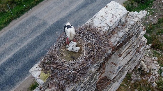 Edirne'de ekili alanlara yakın yerlere yuvalanan leylekler yavrularını korumak için yuvanın başından ayrılmıyor.