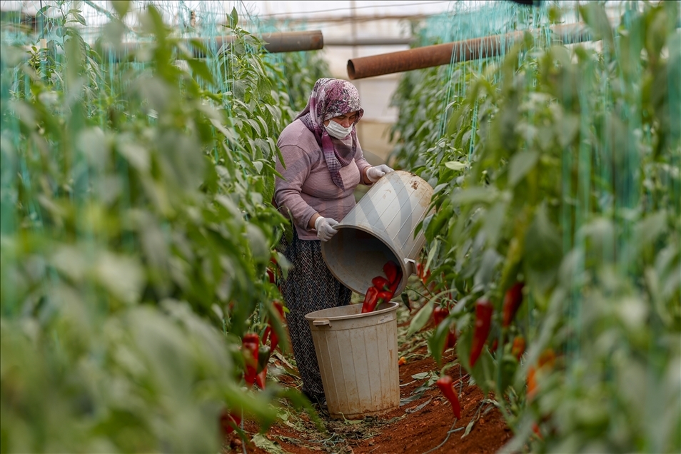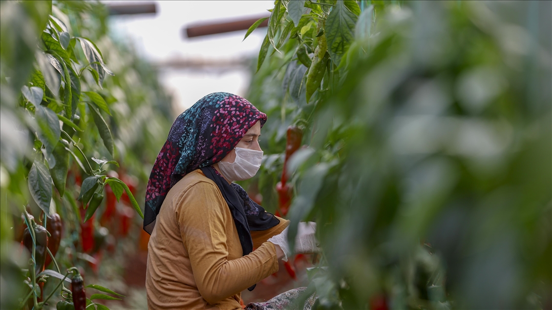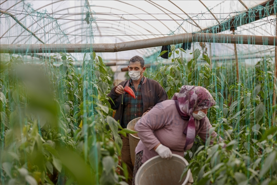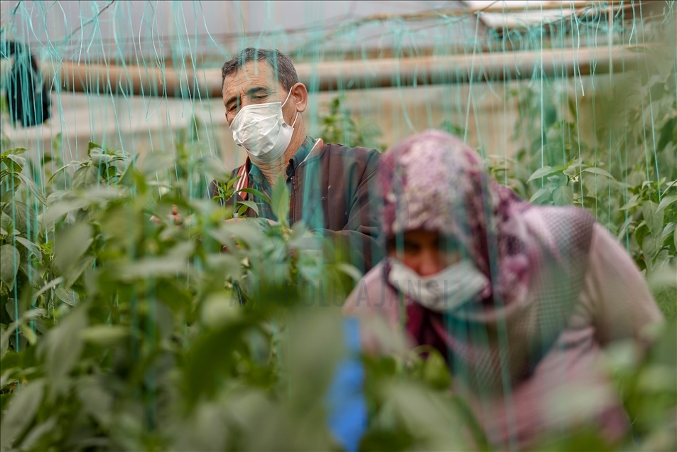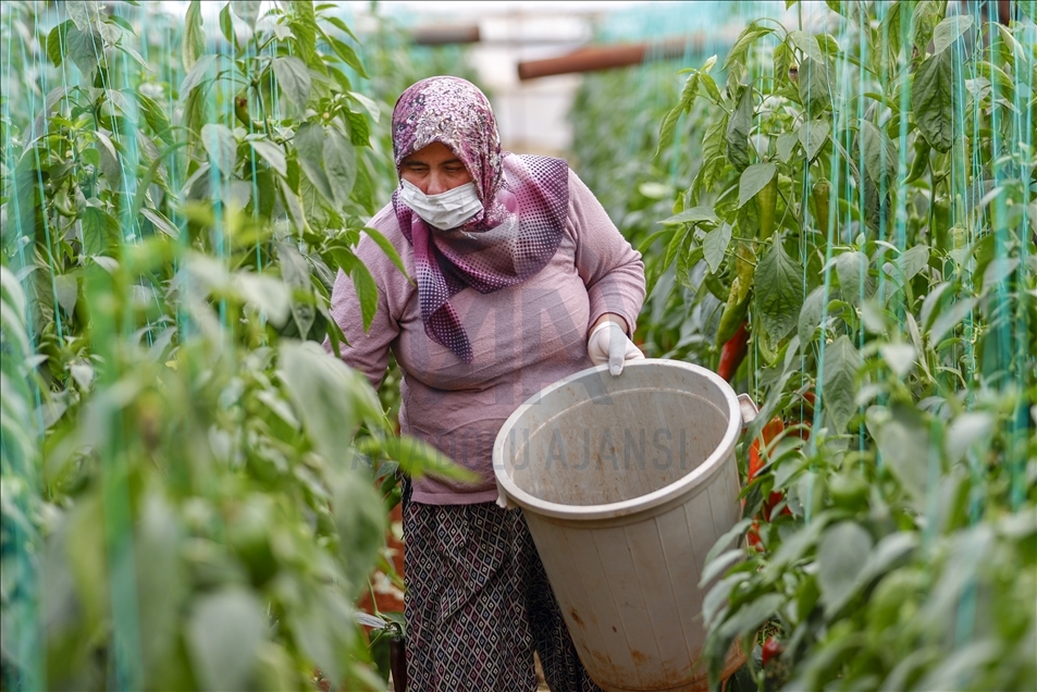 Türkiye'de örtüaltı tarımda önemli yere sahip olan Antalya'da, salgın sürecinde üretim kesintisiz sürdürülüyor. Kepez ilçesi Menderes Mahallesi'ndeki çiftçiler, maske ve eldiven takarak seralar çalıştı.