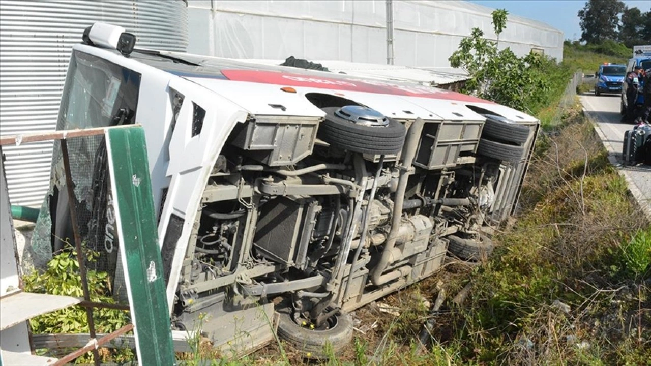 Fatih K. idaresindeki 07 AVN 799 plakalı tur midibüsü, Gündoğdu Mahallesi Yörük Mustafabey Bulvarı'nda kontrolden çıkarak yol kenarına devrildi.