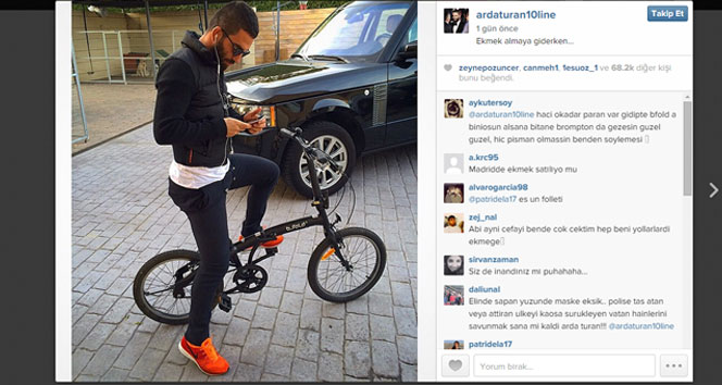 Atletico Madrid forması giyen milli yıldız Arda Turan, Insatgram'da 'ekmeğe giderken' notuyla paylaştığı fotoğraf olay oldu. Ünlü futbolcunun bisiklet üzerinde çektirdiği ve 'ekmeğe giderken' notuyla paylaştığı fotoğraf takipçileri tarafından oldukça beğenildi.