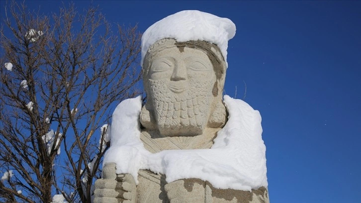 Buradaki kazılarda çıkarılan kral Tarhunza heykelinin höyük girişindeki replikası da kardan pelerinini giydi.