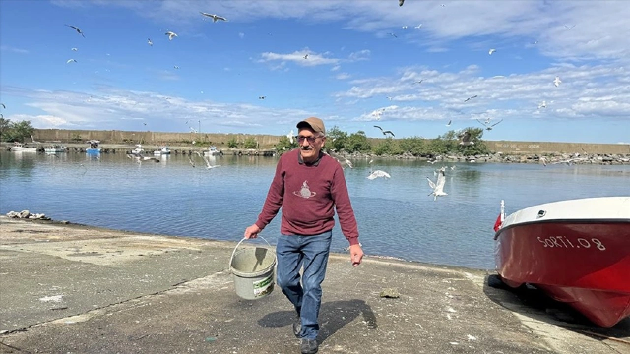 İlçedeki bir balık restoranında balık ustası olarak çalışan 65 yaşındaki Abay, balık artıkları ve ekmekleri çöpe atmayarak martılar için biriktiriyor.