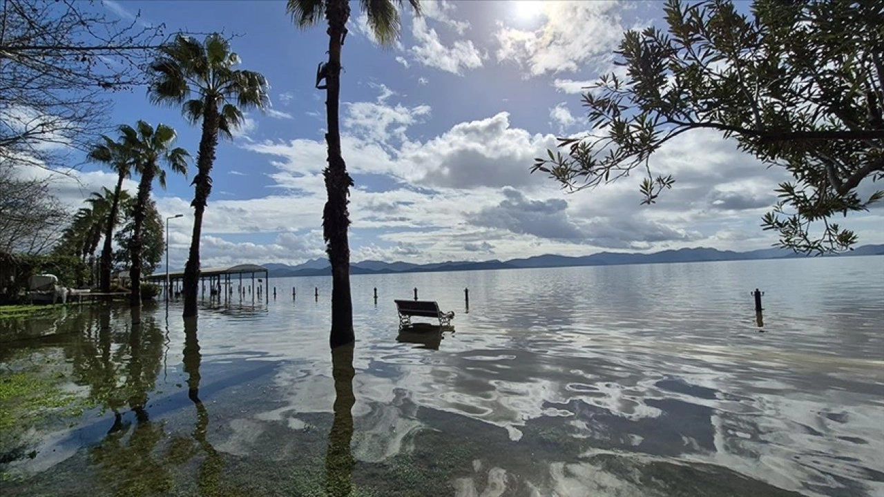 Köyceğiz Gölü'nde su seviyesi , Yağış lar ve kuvvetli lodosla birlikte yükseldi .