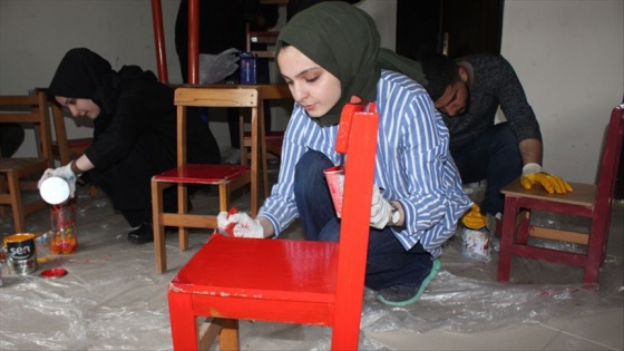 Proje kapsamında Ağrı'nın Eleşkirt ilçesine bağlı Sultanabat Köyü İlkokulu'na gelen dernek üyesi gönüllü öğrenciler, atıl durumdaki sıra ve masaları onarıp kullanılmayan bir sınıfı boyamaya başladı.