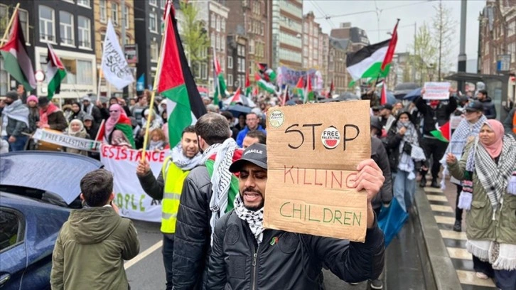 Eylemciler, "Amsterdam soykırıma hayır diyor", "Açlığı durdur", "Özgür Filistin", "Gazze'deki soykırımı durdur, "Hollanda utan, ellerinde kan var" ve "İsrail terörist, Netanyahu terörist" sloganları attı.