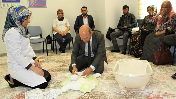 Van'da Sağlık Bilimleri Üniversitesi (SBÜ) Bölge Eğitim ve Araştırma Hastanesinde açılan "gebe okulu"na katılan baba adayları, oyuncak bebeklerle uygulamalı olarak bebeğin altını bağlama, banyosunu yaptırma, gazını alma ve üstünü değiştirme eğitimleriyle bebek bakımını öğreniyorlar.