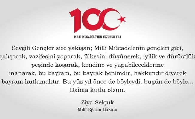 Milli Eğitim Bakanı Ziya Selçuk, "Milli mücadelenin gençleri gibi çalışarak, vazifesini yaparak, ülkesini düşünerek, iyilik ve dürüstlük peşinde koşarak, kendine ve yapabileceklerine inanarak, bu bayram, bu bayrak benimdir, hakkımdır diyerek bayram kutlamaktır" dedi.