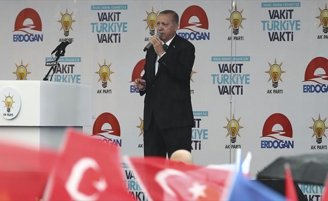 Cumhurbaşkanı Erdoğan, "2023 hedeflerimize ulaşarak ülkemizi iki kat daha büyütmeye talibiz. Bizim siyasetimiz daima hizmet siyaseti olmuştur. Biz bu millete efendi olmaya değil, hizmetkar olmaya geliyoruz. Bugüne kadar hep bu anlayışla çalıştık. 24 Haziran'da da milletimizden yeniden hizmet için, yatırım için, proje için destek istiyoruz." dedi.