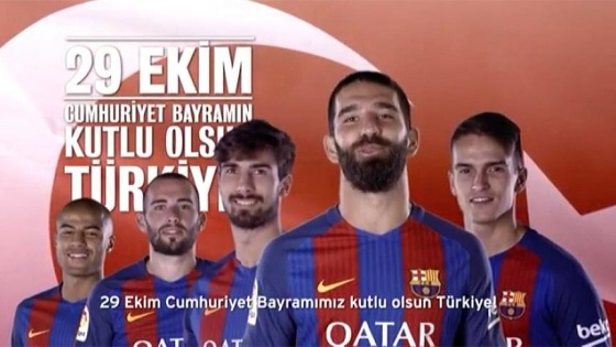 İspanyol kulübü ve Arda Turan'ın sosyal medyadaki Twitter hesaplarında Türkiye Cumhuriyeti'nin 93. kuruluş yıl dönümü dolayısıyla paylaştığı videoda, milli futbolcunun yanı sıra Türkçe konuşmalarıyla Denis Suarez, Andre Gomes, Aleix Vidal ve Rafinha yer aldı.