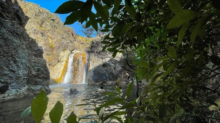 Vadi içerisinde mola veren ziyaretçiler, şelalelerin altında oluşan küçük göllerde yüzerek serinliyor.