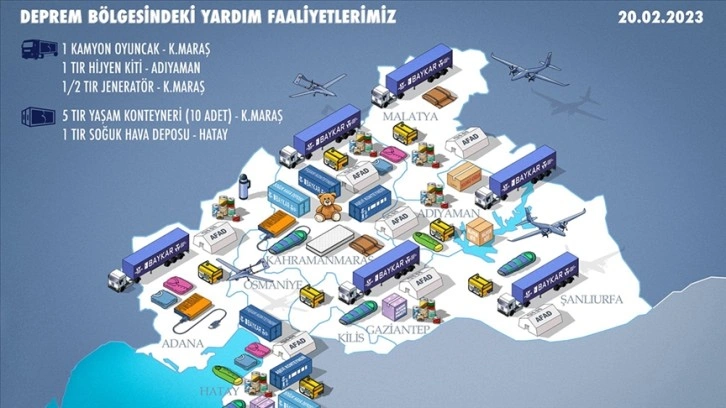 Deprem bölgesindeki yardım faaliyetlerimiz AFAD ile koordineli bir şekilde devam ediyor.#BirlikteDahaGüçlüyüz pic.twitter.com/ikQEEhtNRQ— BAYKAR (@BaykarTech) February 20, 2023Baykar tarafından bugüne kadar deprem bölgesine gıda, kıyafet, yatak, hijyen kitleri, jeneratör, elektronik cihaz ve insani yardım malzemesi taşıyan toplam 57 yardım tırı gönderildi.