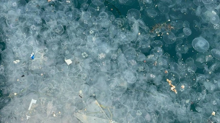 Denizanaları, sahil boyunca yer yer yoğunluk oluştururken suyun üzerinde biriken evsel atıklar dikkati çekti.