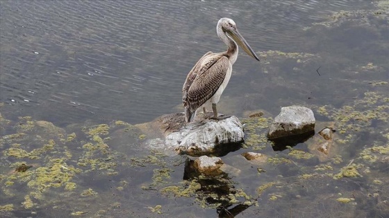 Tek başına su yüzeyinde gezinti yaparak beslenen ve bir taşın üzerine çıkan pelikanı görüntüleyen vatandaşlar, göçebe kuşun fotoğraflarını çekip sosyal medyada paylaşıyor.