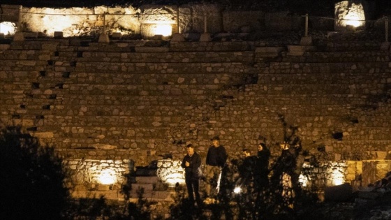 Efes Antik Kenti'ndeki ışıklandırma için teknik ekibin bir gün önce bakım çalışması ve deneme yaptığı öğrenildi.