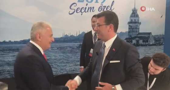 AK Parti İstanbul Büyükşehir Belediye Başkan Adayı Binali Yıldırım ile CHP'nin İstanbul Büyükşehir Belediye Başkan Adayı Ekrem İmamoğlu'u dün Lütfi Kırdar Kongre ve Sergi Merkezi'nde İsmail Küçükkaya moderatörlüğünde bir araya geldi. “ İstanbul 2019 seçim özel” isimli programda biraya gelen ikilinin ilk karşılaşma anı görüntüleri ortaya çıktı. Görüntülerde, Yıldırım'ın ve İmamoğlu'nun bir birilerine sarılarak selamladıkları görüldü. İkilinin daha sonra canlı yayına hazırlık yaptığı görüldü.