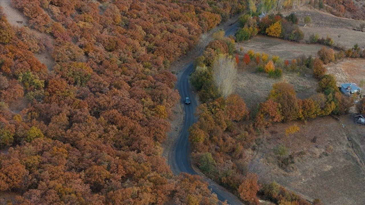 Ağaçlar ve bitki örtüsündeki sonbahar renklerinin kıvrımlı yollarla bütünleştiği manzaralar dronla kaydedildi.