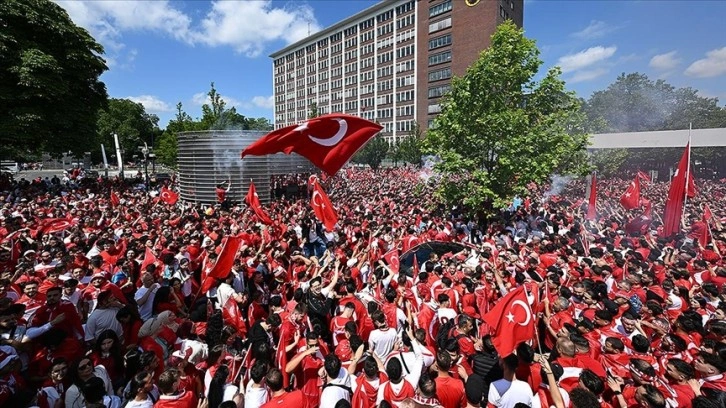 Taraftarların yürüyüşü sırasında çevre binalardan ay-yıldızlı bayraklarını sallayan Türkler, milli takıma destek oldu.